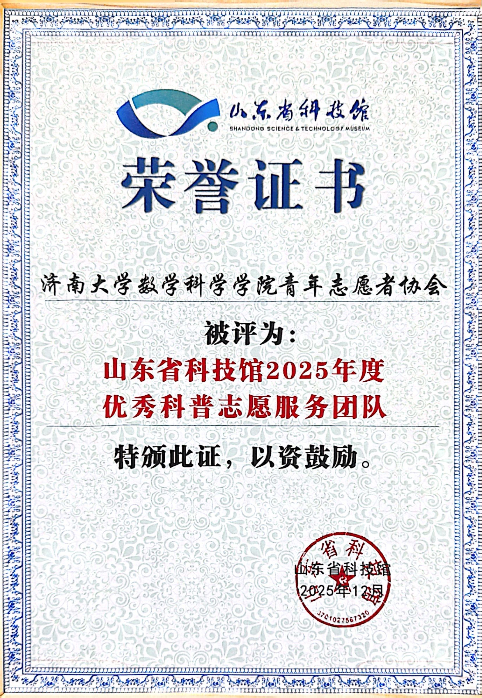 青年志愿者协会凭借卓越的团队协作能力与亮眼的服务实绩,荣膺年度优秀科普志愿服务团体奖;学院学生会青年志愿者协会主席田芮菡获评山东省科技馆2025年度优秀科普志愿者,充分彰显出数院学子的青春担当与志愿风采。