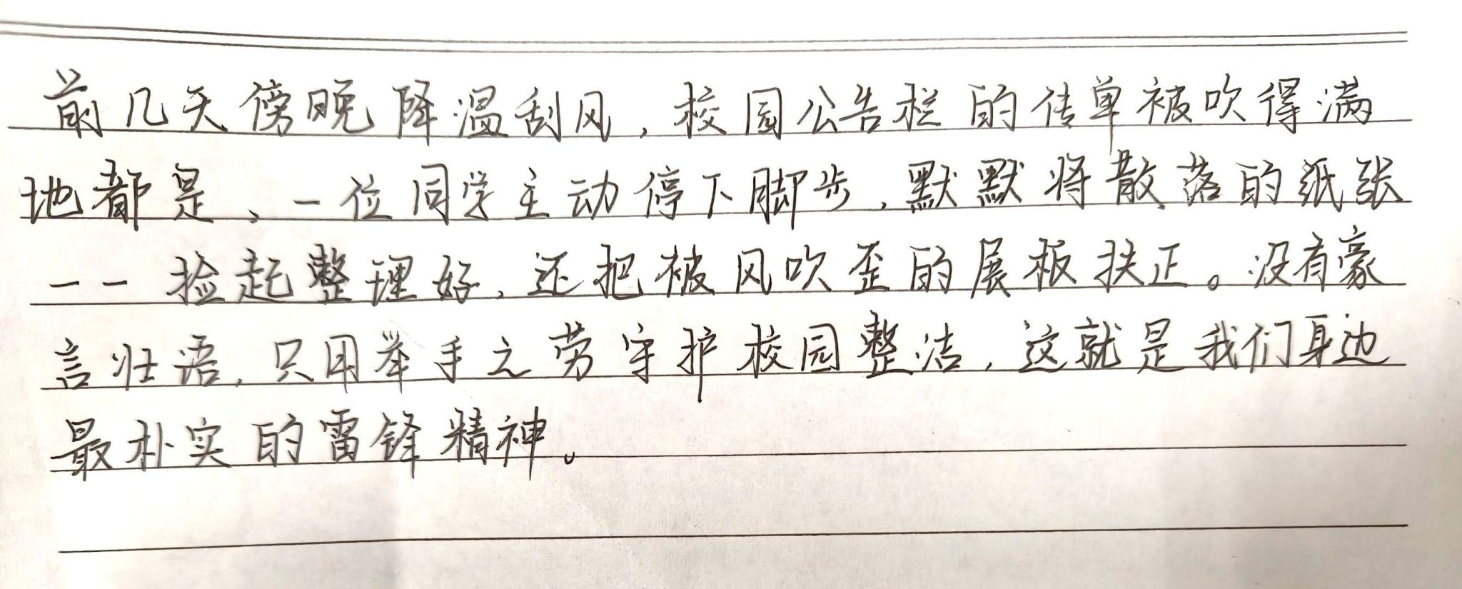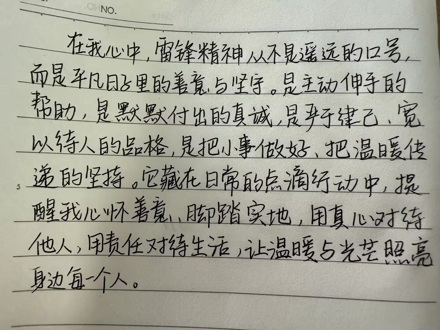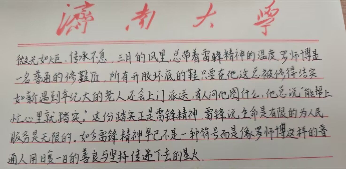 活动期间,同学们围绕主题展开文段创作,以手写形式表达对雷锋精神的理解与感悟。从助人为乐的温暖瞬间,到志愿服务中的亲身经历,再到对奉献精神的深刻思考,一篇篇真挚的文字展现出同学们对雷锋精神的时代诠释。手写材料统一上传至活动群相册,形成一份份有温度、有力量的精神印记。